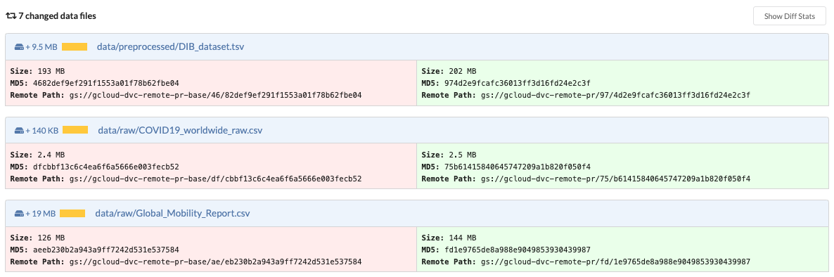When you open a data science pull request in your project, DagsHub detects the changes in the cached files of your DVC project and displays the list of changed files in the Files changed tab of the data science pull request.