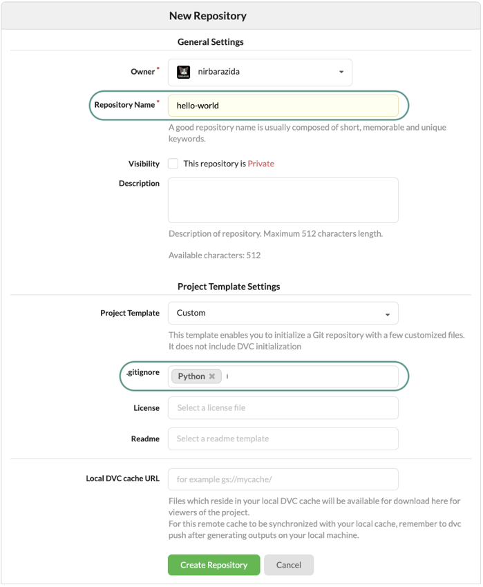 • Fill in the name of the repository as 'hello-world' and add Python to the .gitignore file selector. Then click the 'Create Repository' button at the bottom.