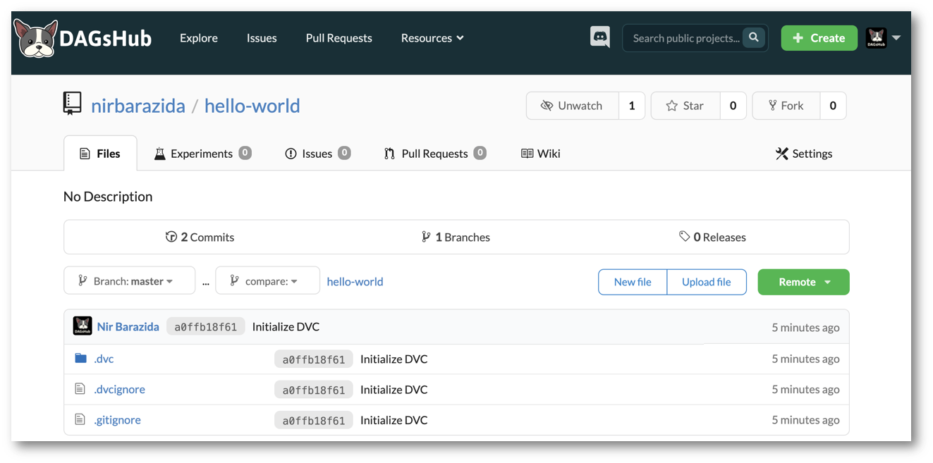 In order to host the data & models alongside our code, we need to create a DVC storage remote. What this usually means is signing up for a cloud account, creating a storage bucket, configuring permissions, etc. This process can be a hassle, even if you are familiar with it. To save you the trouble, we created a free, zero-configuration DVC remote called DagsHub Storage!