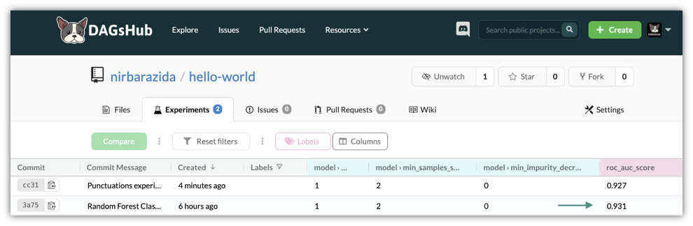 • This is where the magic happens - with DagsHub, we can easily compare the model's performance between the two experiments. We will simply open the Experiment Tab in the DagsHub repository and compare the model's ROC AUC scores: