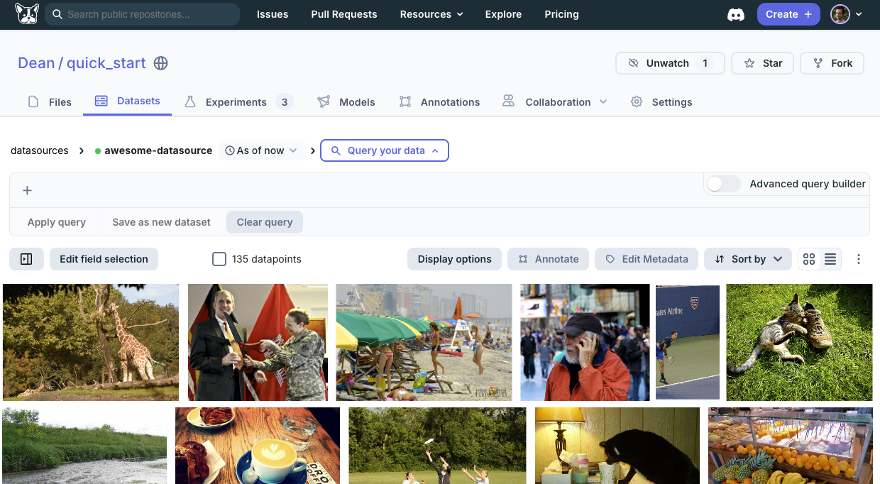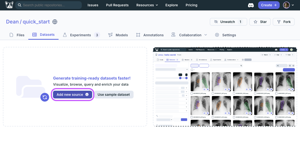 $ pip3 install dagshub - Run the following code to create the datasource:
