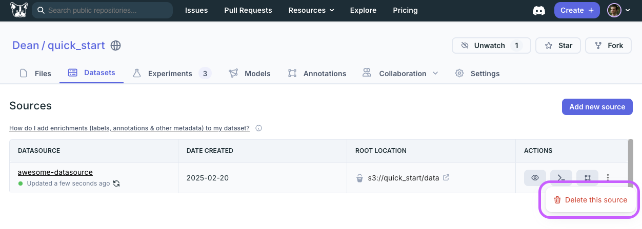 from dagshub.data_engine import datasources ds = datasources.create_datasource( repo="<user_name>/<repo_name>", # User name and repository name separated by a "/" name="awesome-datasource", # Name of your datasource path="s3://<repo_name>/<path_to_data_folder>" # Path to your data folder in your repo, this example is for a path inside DagsHub Storage, for a different bucket or files in the repo, use the appropriate path. ) - Deleting the Datasource - To delete the datasource, simply run:
