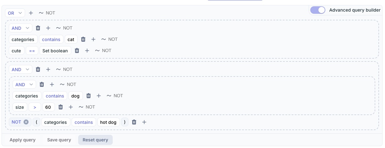 Sometimes a simple AND query isn't enough, and you need to have complex NOT and OR queries. By toggling the advanced query mode, you can create these complex queries easily.