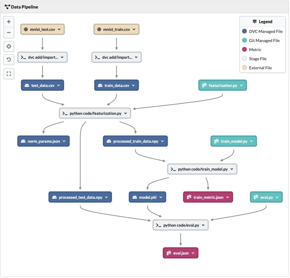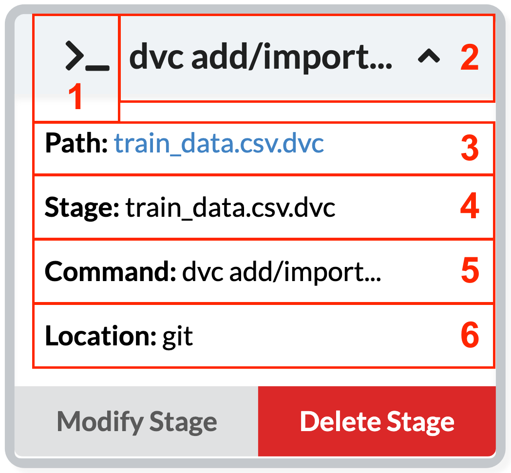 .dvcfiles are always checked into the git repo. - The command that created this stage. We may truncate it if it's too long. In this case, the command is just a dvc add or import. Later in the tutorial, we will see stages where the command is more complex and defined by the user.