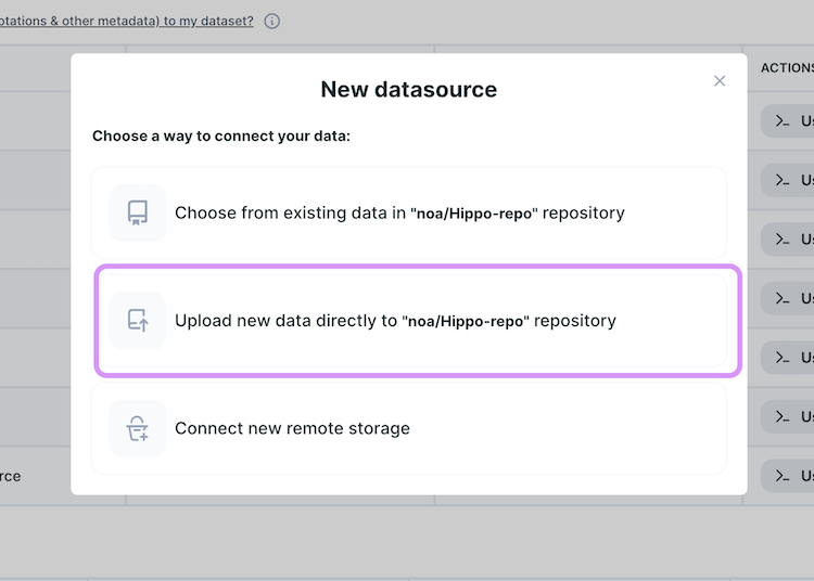 To create data source with new data, you will first have to add the new data to your repository. There are 3 ways to upload new data to a DagsHub repository: