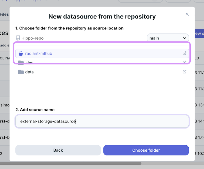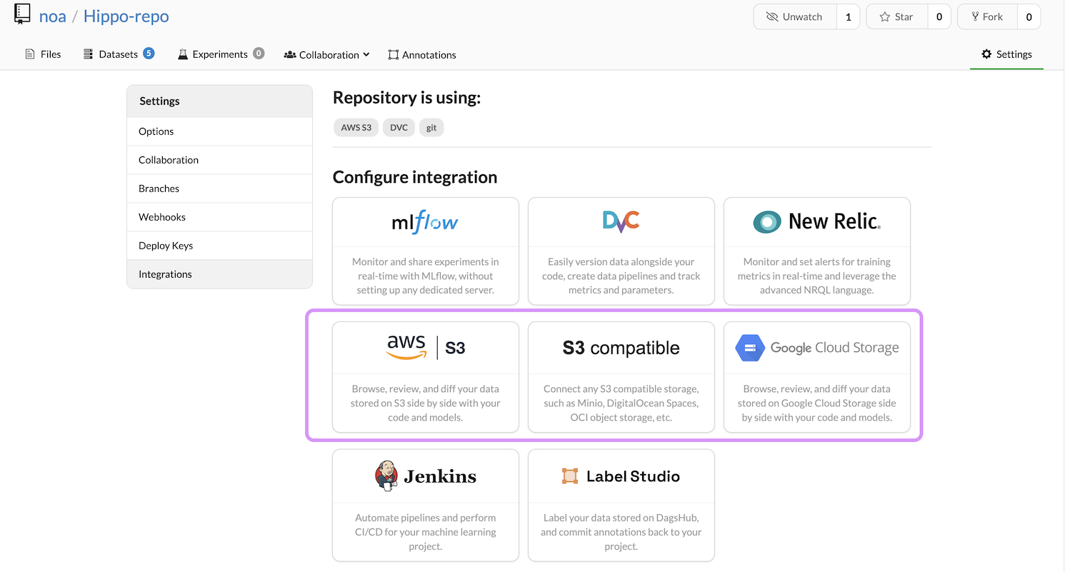 Before creating a data source from external storage, you will have to connect it to your repository using DagsHub UI.