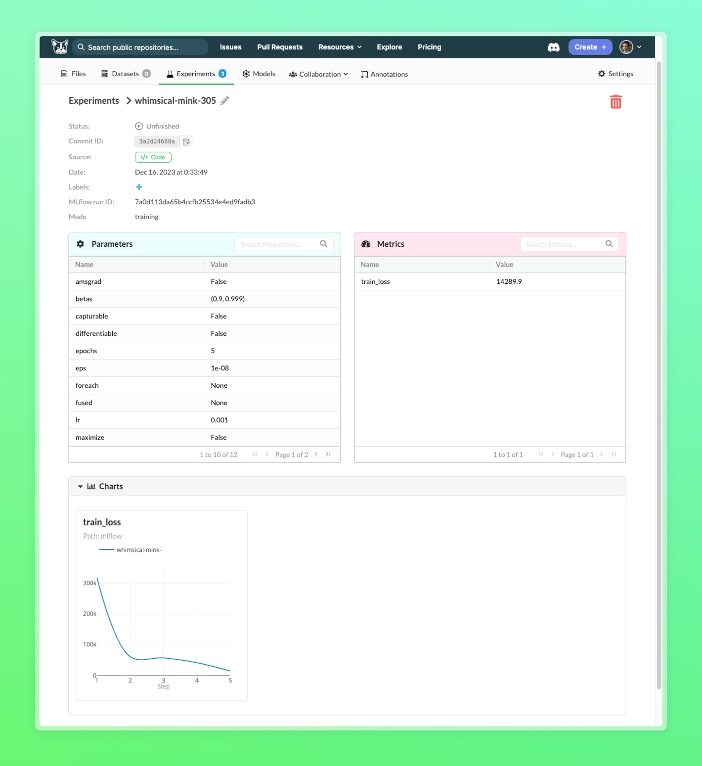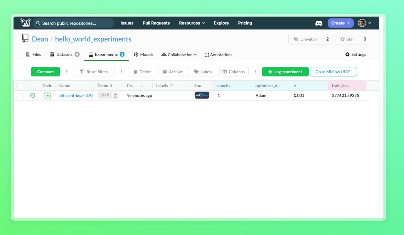 DagsHub integrates with MLflow to provide an easy way to track experiment parameters and metrics, and provides a built-in integration with Git and dataset management which means all your experiments become fully reproducible.